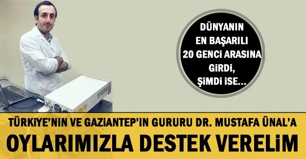 Gaziantepli Dr. Mustafa Ünal, kemik sağlamlığını ölçen yeni bir tıbbi teknoloji geliştirerek ‘Dünyanın 10 Başarılı Genci’ yarışmasının finallerine kalarak büyük bir başarıya imza attı. Dr. Mustafa Ünal’ın emeğinin karşılığını alması ve daha büyük başarılara imza atması için bizlere de ona oy vermek düşüyor.